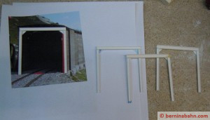 Die Lungaeinfahrt habe ich mit Polystyrol-Profilen und 3 mm – Hölzchen konstruiert. Die sich links oben befindlichen Dreiecke zur Stabilisierung der Konstruktion zur Mauer habe ich aus Plastikteilen von Cottage-Cheese-Deckelverpackungen gemacht. Mit Sekundenkleber hat sich alles sehr gut kleben lassen.. Die Wellbleche sind noch nicht fixiert und liegen deshalb noch nicht in der optimalen Position. …