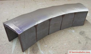 Der Scala-Gallerie fehlte schon seit langem das Wellblechdach. Da die Gallerie in einer Kurve liegt, kann ich nicht auf ein herkömmliches und im Modellbau erhältliches Wellblech zurückgreifen. Selbstbau ist angesagt! Auf einer Backofenbodenfolie habe ich den ungefähren Verlauf der Gallerie eingezeichnet und dann ausgeschnitten. Mit einem Stück Modell-Wellblech wurde anschliessend die Wellenform durch Drüberfahren übertragen. …