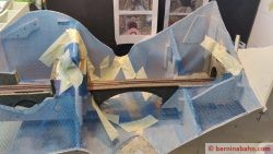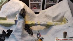 In den vergangenen Tagen wurde die Geländehaut mit Gipsbinden gefertigt. Vor der Felsenbildung füllte ich die Geländehaut mit Bauschaum (schön brav im Freien, damit die krebserregenden Stoffe nicht im geschlossenen Raum bleiben), damit am Schluss die gesteckten Bäume auch halten.