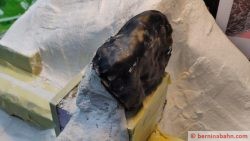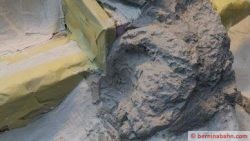 Seit heute bin ich am Gipsfelsen giessen. Wie üblich verwende ich dafür Silikonformen, die mit anziehendem Gips gefüllt mit beiden Händen auf die Geländehaut gedrückt werden. Zieht der Gips an, lasse ich die Silikonform noch etwa zehn Minuten drauf, bevor ich sie wieder abziehe. Unterdessen kann ein neuer Gipsabdruck gegossen und aufgedrückt werden. So ist es möglich, in einer Stunde vier Abgüsse zu bewerkstelligen.