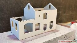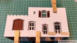 Nach der üblichen Grundierung mit grauem Primer-Spray wurde eine erste Stellprobe gemacht: Das Haus bekommt noch einen dritten aufgerollten Weissanstrich, ebenso werden die Rahmen nochmals etwas nachgedunkelt, so dass alle in etwa dieselbe Farbe haben.