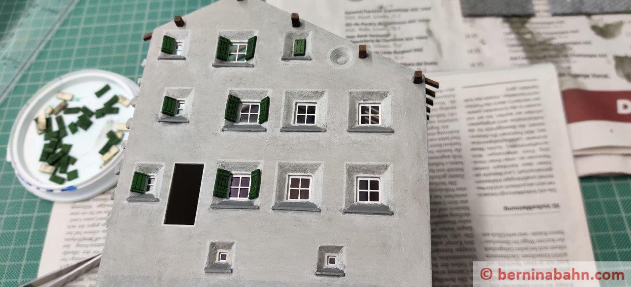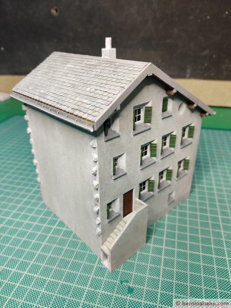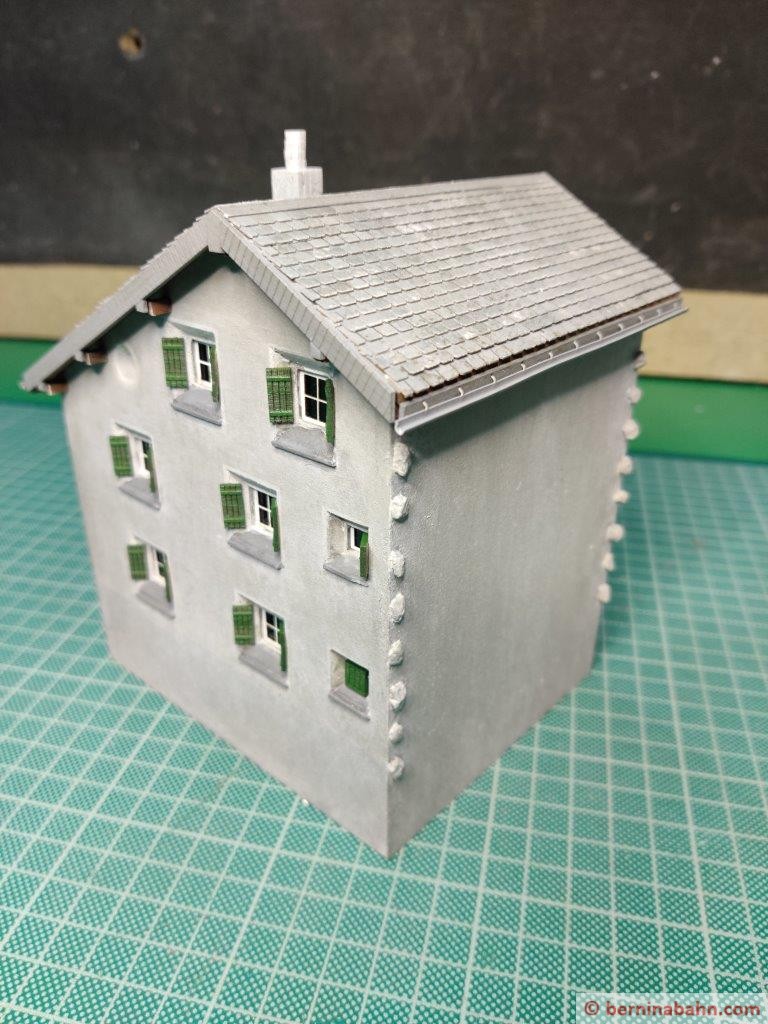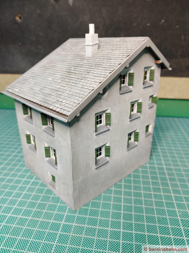 - Das Dache habe ich nochmals neu gemacht. Die Dachschindeln waren mir zu grob. Anhand eines Originalfotos wurde die genaue Anzahl der Schindeln gezählt und nachgebildet.