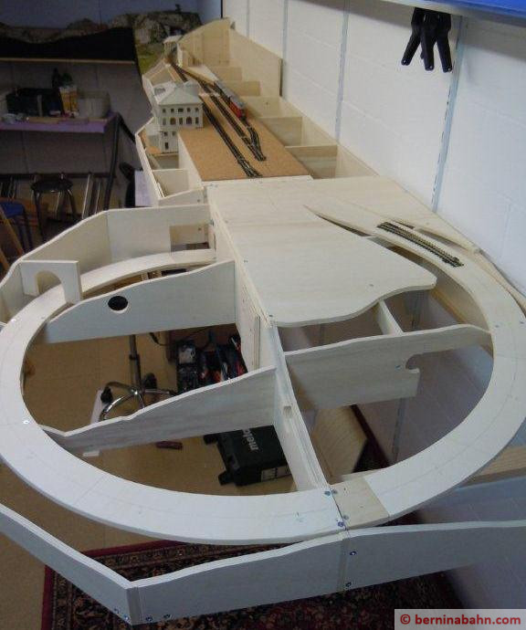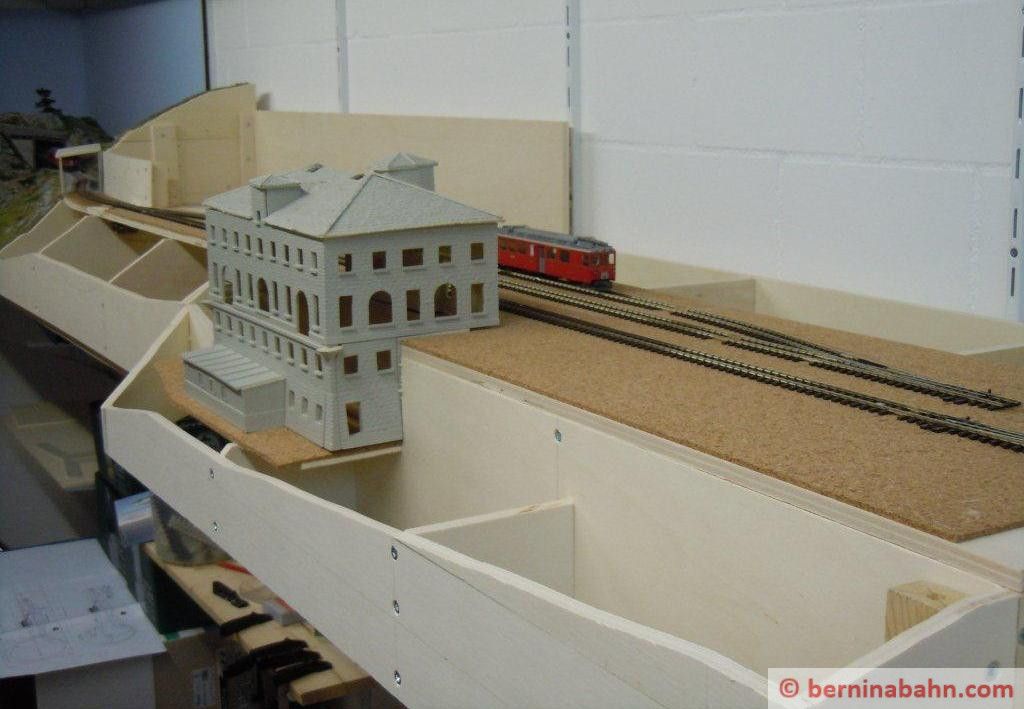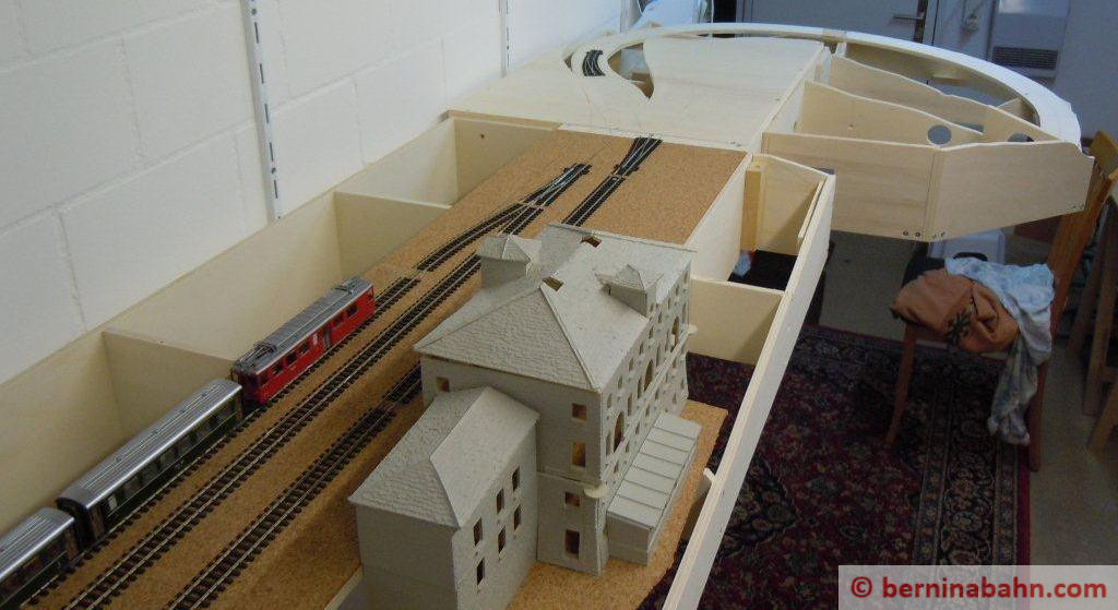 Nach einigen Abenden Arbeit habe ich nun das Gröbste der beiden neuen Segmente der Grüm-Kurve fertig gestellt. Ebenfalls habe ich für das Empfangsgebäude eine 12 cm breite Segmentserweiterung angebracht, so dass es nicht mehr „ausserhalb“ des Segmentes 10 steht.