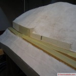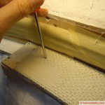 Bei dieser Methode walze ich die tonähliche Masse mit einem Wallholz auf 3 mm -Dicke aus. Die zu „mauernde“ Stelle streiche ich zuerst mit gewöhnlichem Holzleim ein und klebe dann den ausgewallten Teig darüber. Anschliessend ziehe ich mit einem Küchenmesser sanft die horizontalen Fugen ein. Mit einem Schraubenzieher werden nun die senkrechten Fugen angebracht.